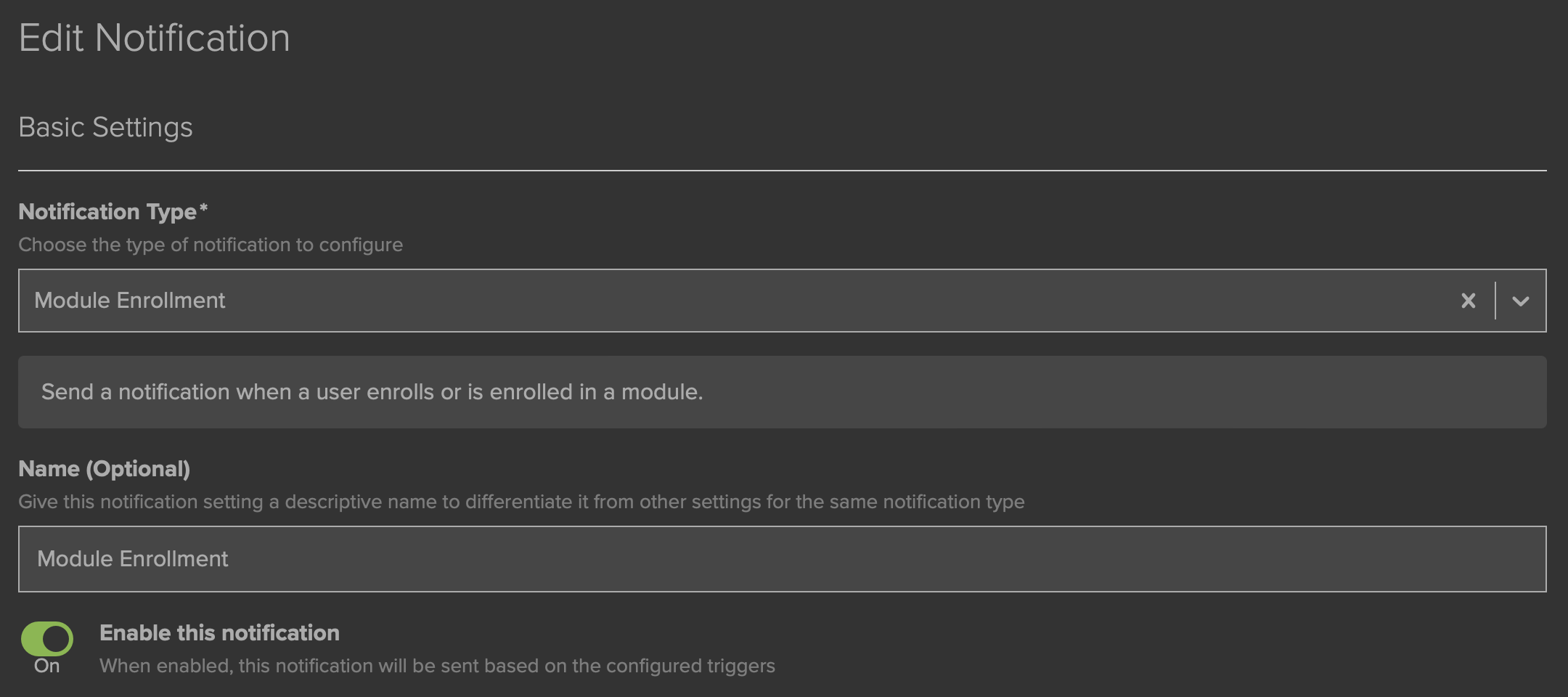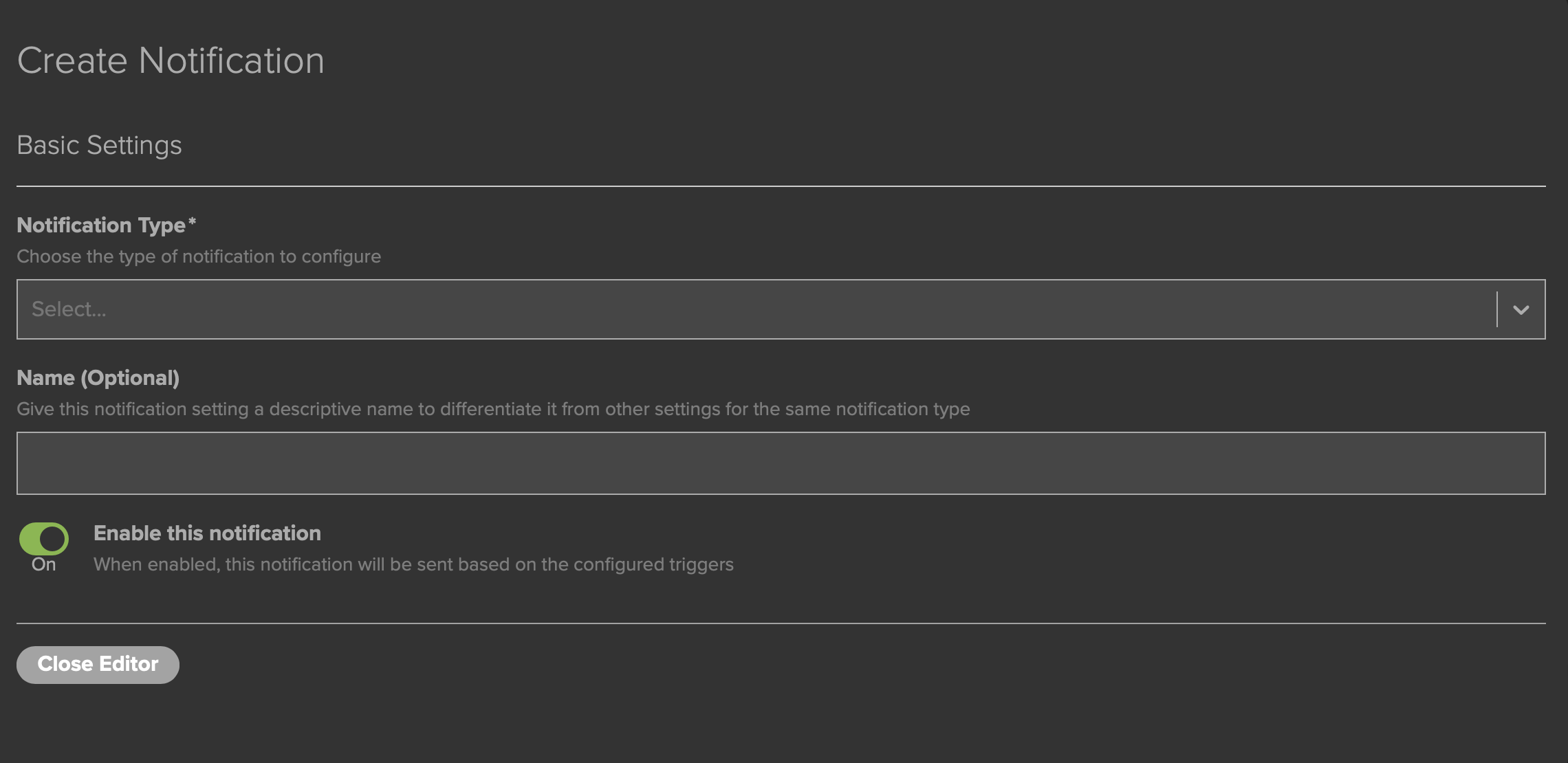 After the Notification Type is selected, if you would like to rename the Notification you may do so in the Name (Optional) field. A number of additional settings should have now appeared on your screen, which we will examine in sections.