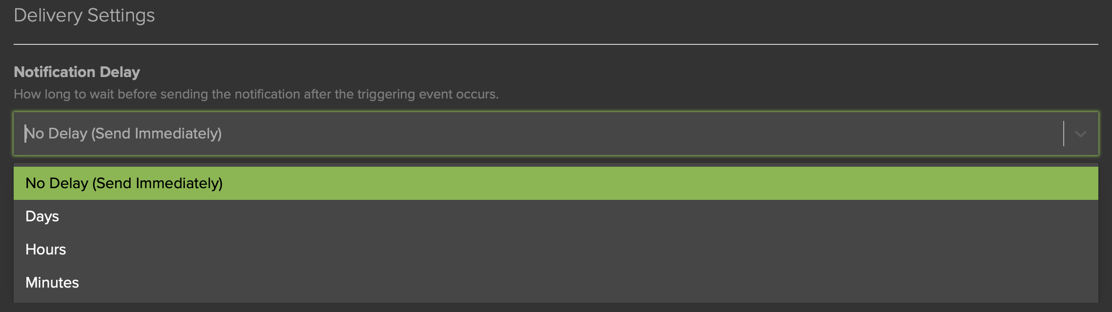 The Notification Delay (Fig. 5) option allows you to set how long the system waits after the triggering event has occurred before the Notification is sent. It can be sent immediately, or after any number of days, hours, or minutes has passed.
