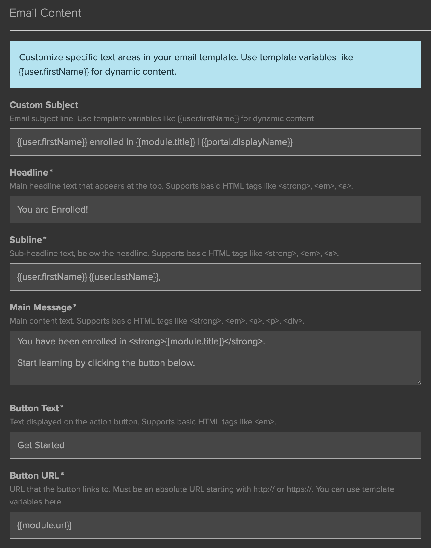Standard HTML tags such as <em>, <strong>, <p> and <div> can also be used in the Email content fields.