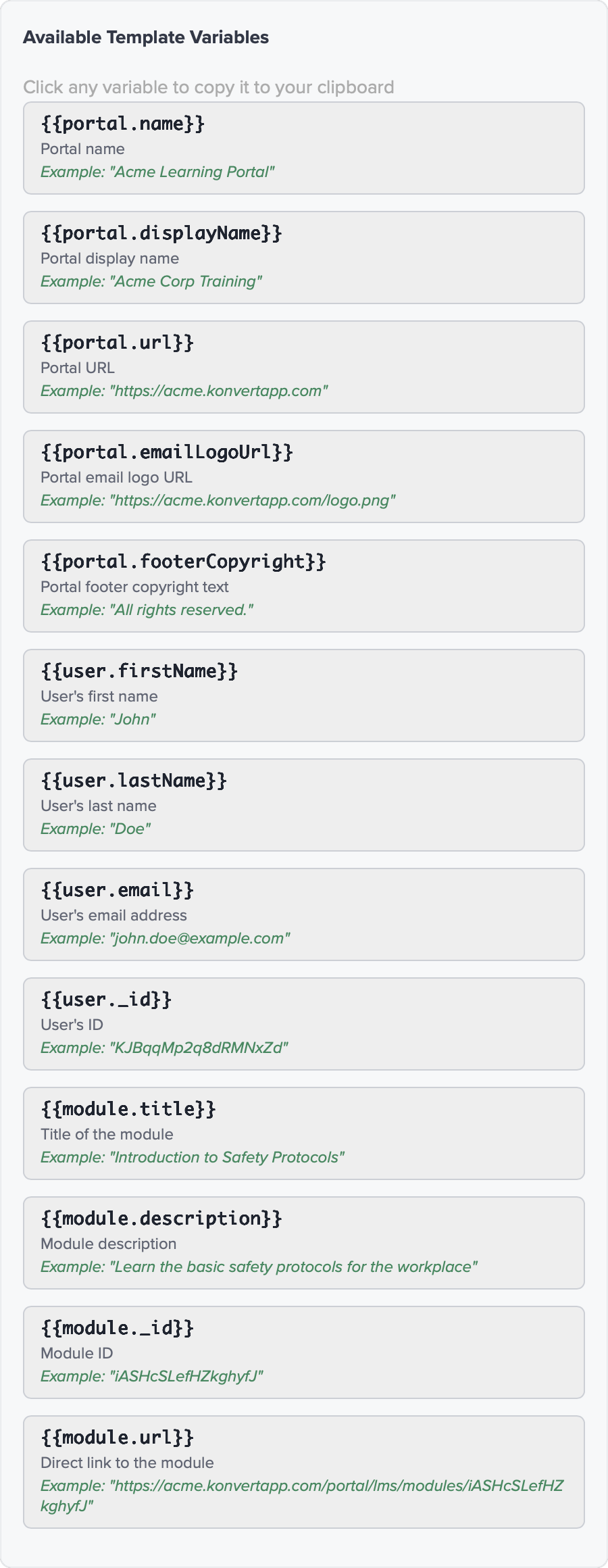 When implementing variables, it is preferable to use the Available Template Variables section (Fig. 11). Rather than typing each variable, you can can simply click them here and they will be copied to your clipboard, and then easily pasted into the fields of the Email Content section (Fig. 10, above).