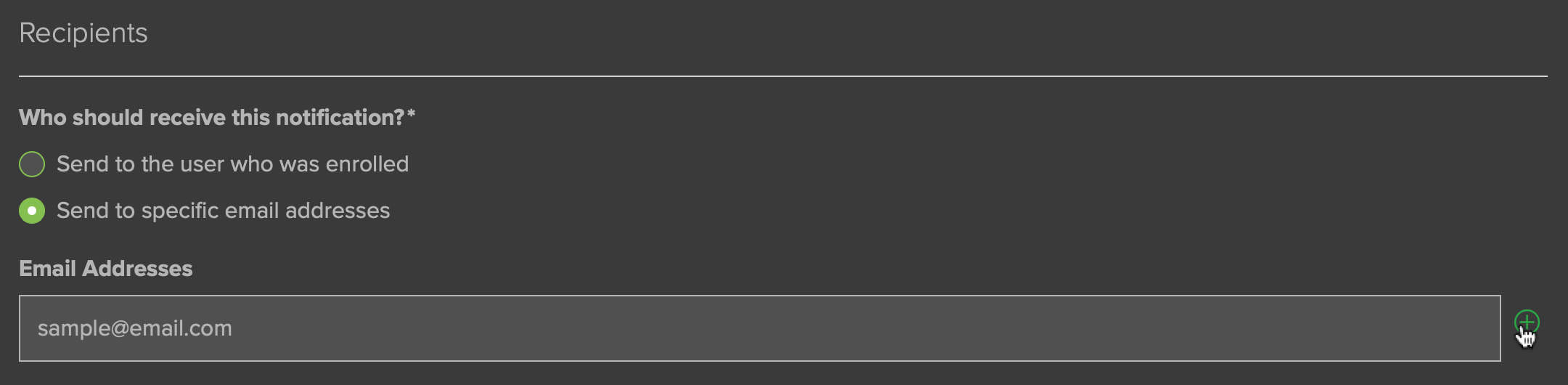For example, if a supervisor needs to know when someone has completed a module, or when someone started and did not complete a module, his or her email can be entered here. To enter multiple emails, click the "+" icon to the right of the email field (Fig. 7).