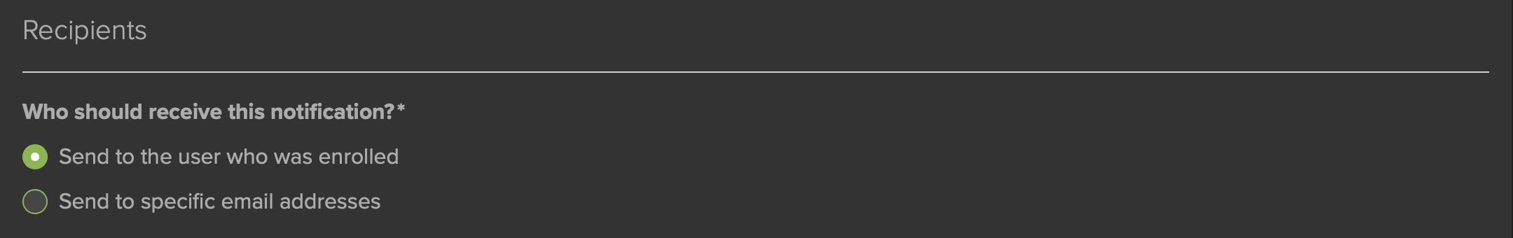 The Recipients section (Fig. 6) allows you to have the Notification sent either to the User who triggered the event, or to any other email address you enter.