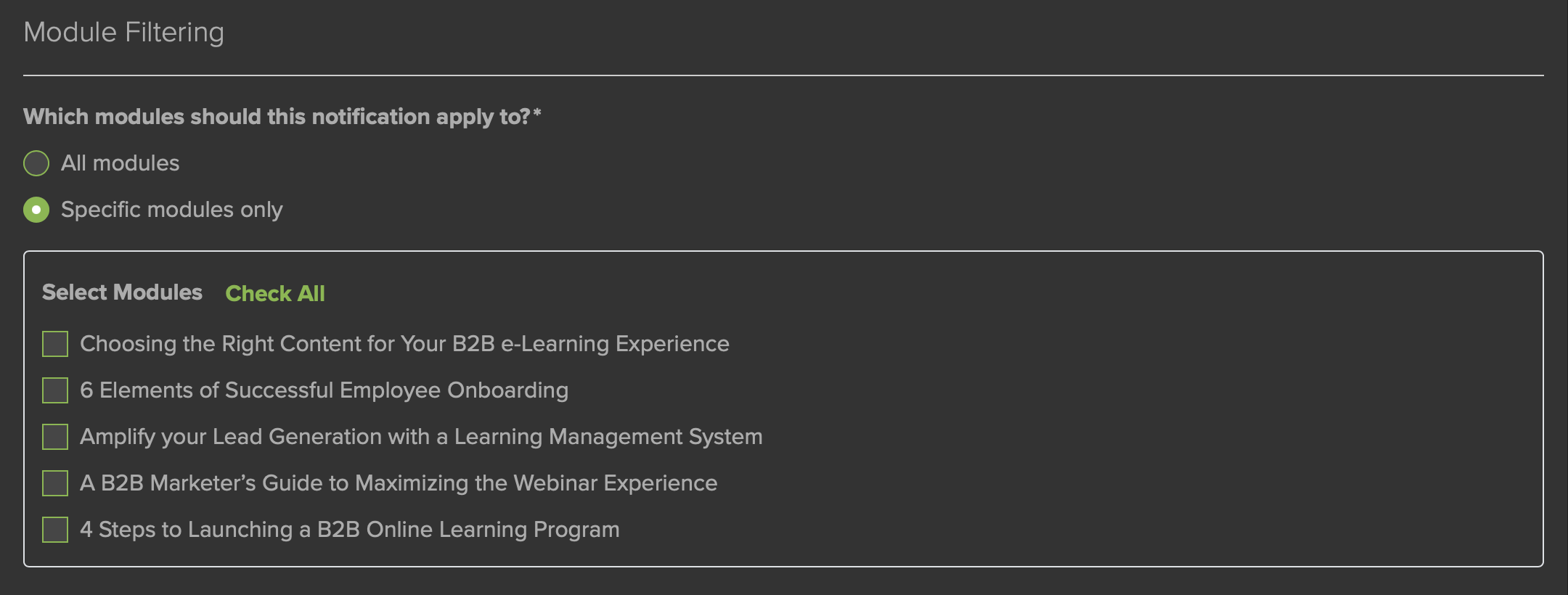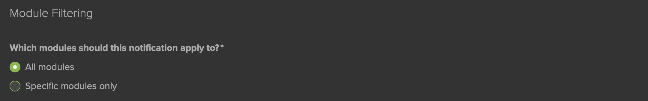 If you would like the Notification to be sent out for some modules but not others, the Module Filtering (Fig. 8) option can be utilized. The default setting is for All Modules.