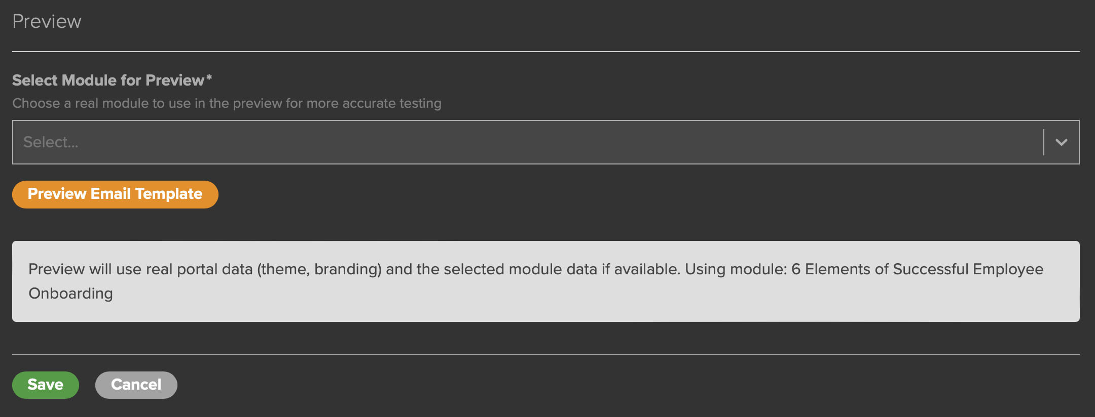 When you are done customizing your email Notification, you have the option to Preview (Fig. 12) it to ensure the text and variables have been set up properly. Choose a Module for the Preview from the Select Module for Preview pop-up, then click the orange Preview Email Template button.