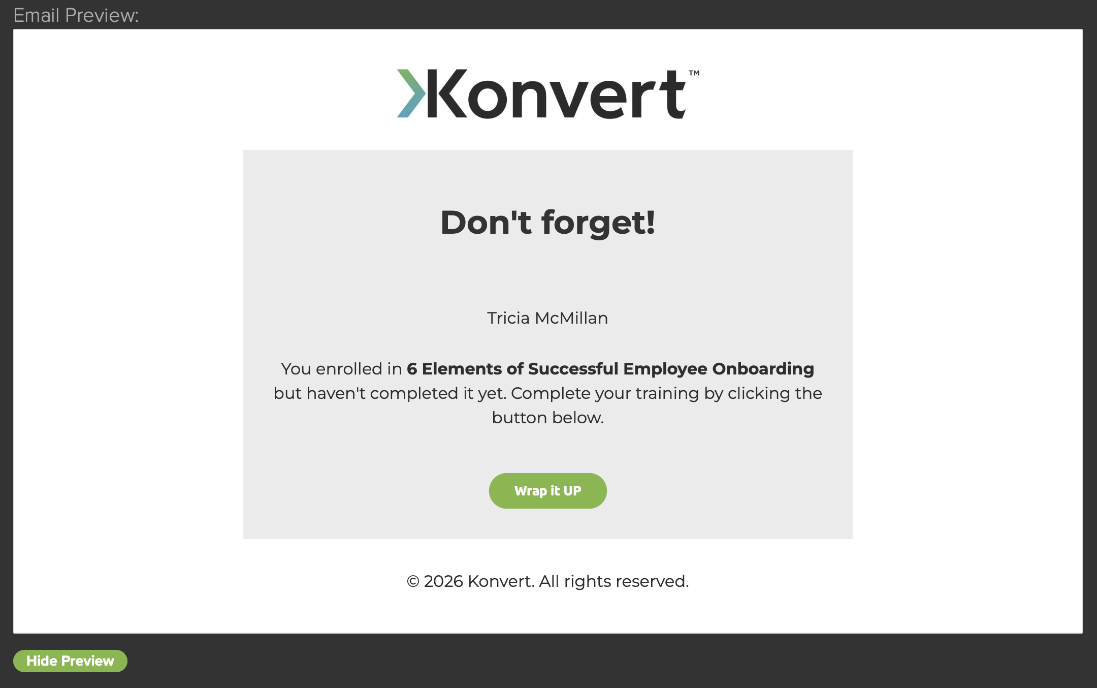 Konvert™ Notifications can be configured to automatically send emails to users when certain events within your Konvert™ portal occur, such as enrolling in a module, completing a module, or neglecting to complete a module within a defined period of time. The emails are highly customizable and can be configured to include personal information like the name of your Konvert™ portal, the name of the module, the user's name and much more.