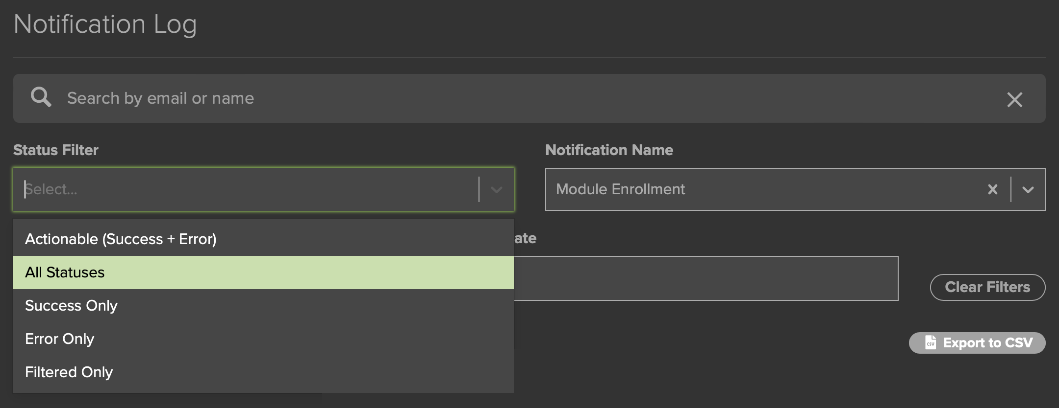To see if a specific User has had a Notification sent to them, enter their email address or name in the Search by email or name field at the top of the screen (Fig. 16, above).
