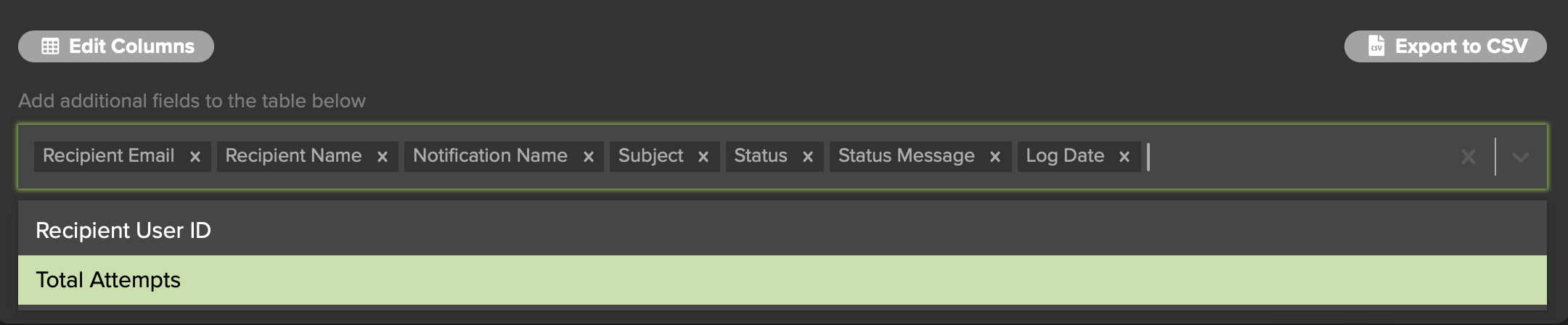 To edit the columns in the log, click the Edit Columns button (Fig. 21), then click the "x" next to the name of the column you'd like to remove, or select a new column from the pop-up that appears below the field.